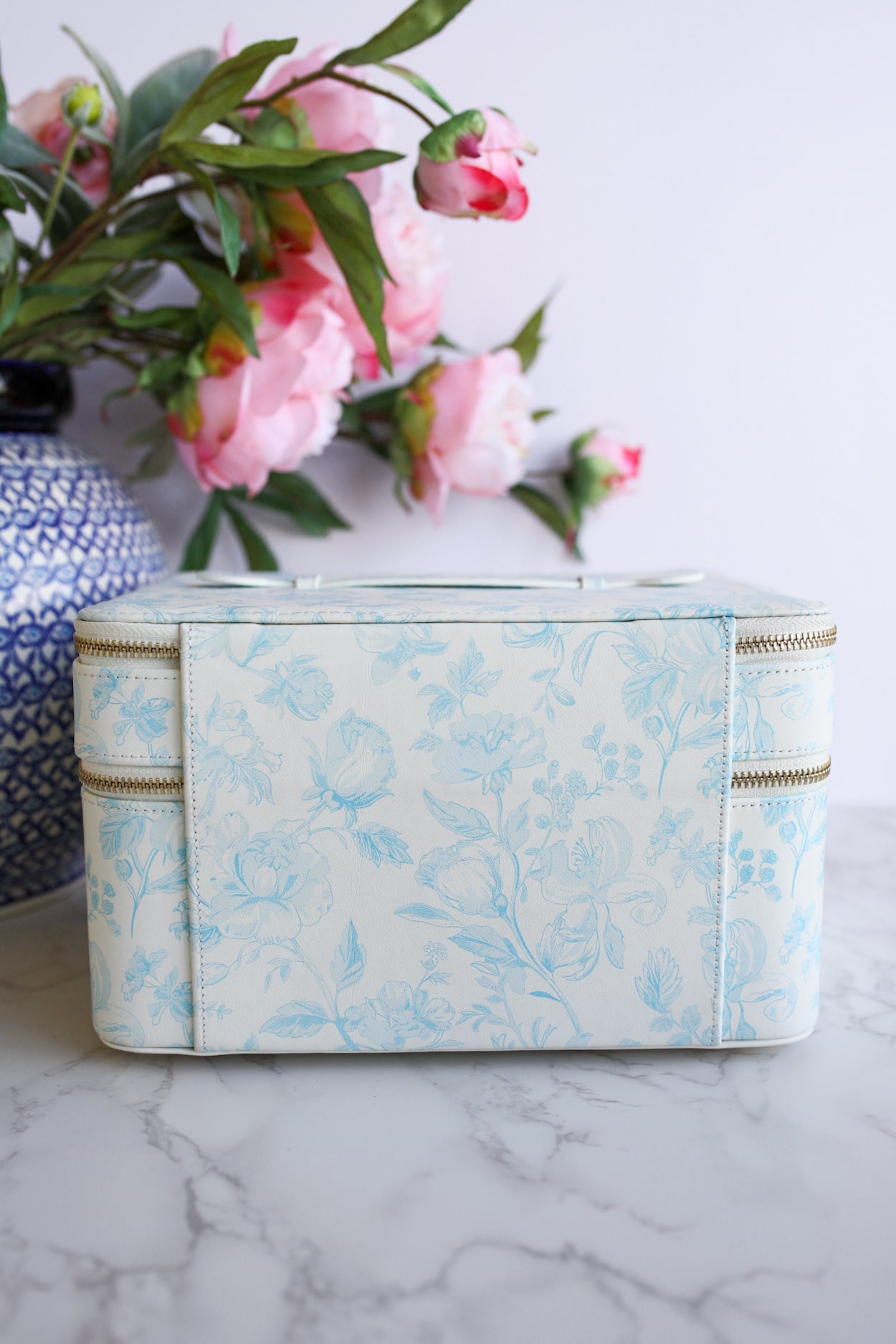 The centerpiece of the Winterbury x Rika King Collection, this Two-Tiered Case embodies timeless elegance and practical design. Created in collaboration with Winterbury Cases, it showcases a delicate powder-blue floral toile pattern printed on smooth, premium leather — a design inspired by antique porcelain and the graceful charm of English garden blooms.