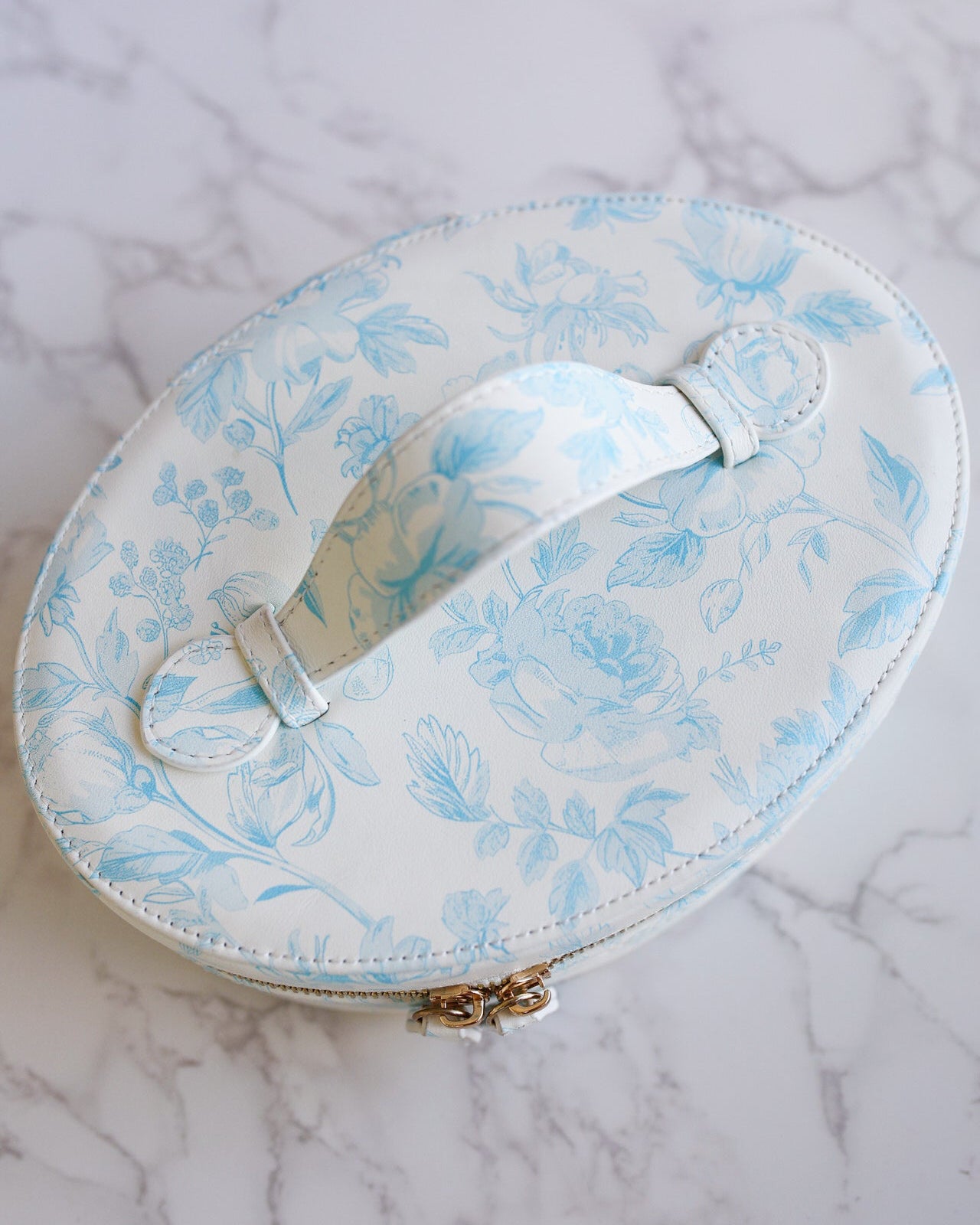 - Crafted from smooth, premium vegan leather and adorned with the signature powder-blue floral toile pattern, the Travel Case opens to reveal a soft suede interior with a removable upper tray and divided lower compartment — ideal for storing scissors, threads, small projects, or jewelry.